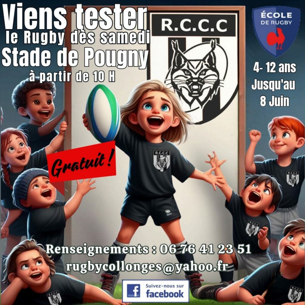 Propose à tous les enfants, filles et garçons de 4 à 12 ans, de venir essayer gratuitement le rugby dans une ambiance familiale les samedis 25 mai, 1er et 8 juin à partir de 10h00 au stade de Pougny.