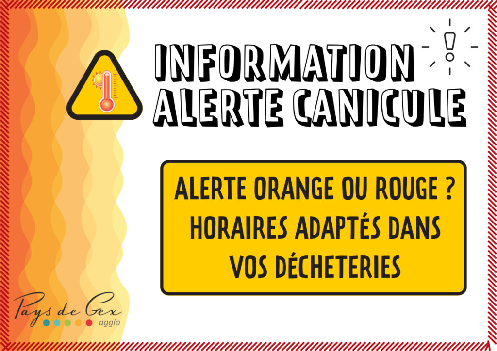 Jusqu’au 30 septembre, en cas d’alerte canicule orange ou rouge (niveau 3 ou plus déclenché par la Préfecture de l’Ain), les horaires des déchèteries et de la plateforme réservée aux déchets verts à Divonne-les-Bains seront modifiés pour préserver la santé de tous.