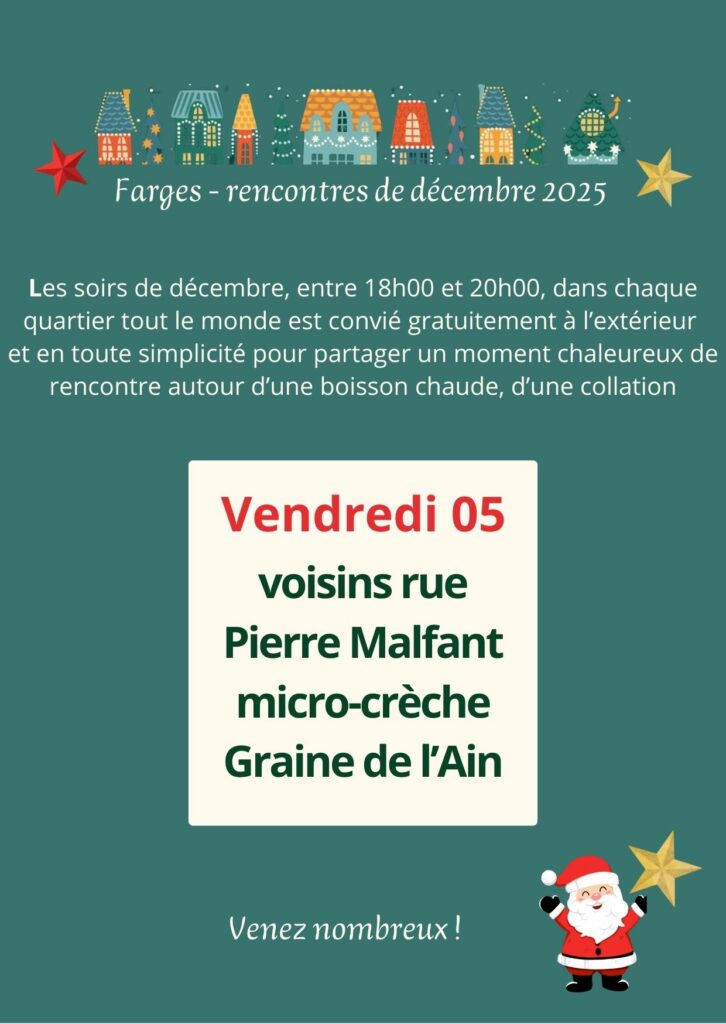 Les soirs de décembre, entre 18h00 et 20h00, dans chaque quartier tout le monde est convié gratuitement à l’extérieur et en toute simplicité pour partager un moment chaleureux de rencontre autour d’une boisson chaude, d’une collation. Vous êtes attendus nombreux.ses En voici le calendrier.