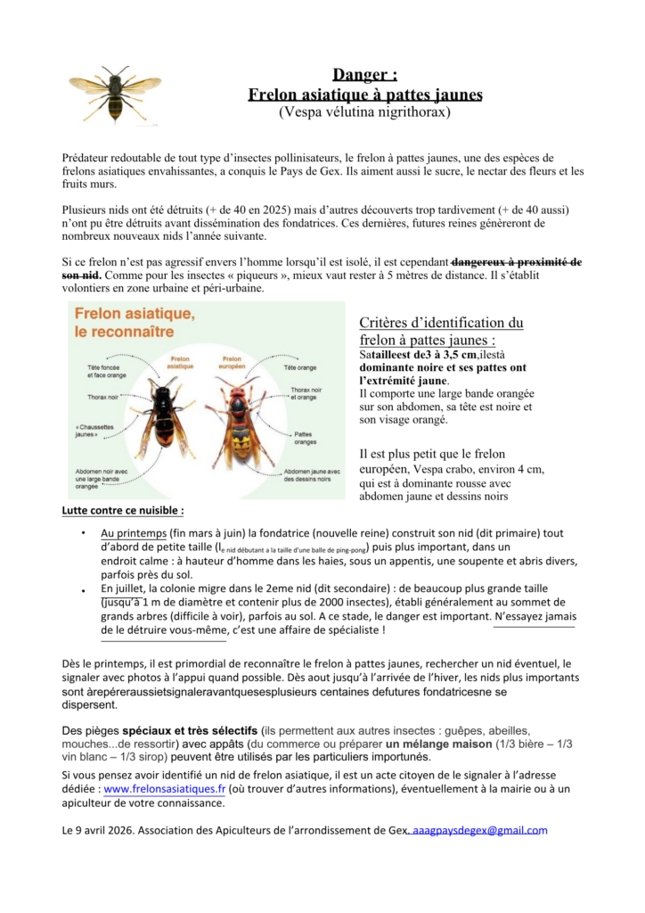 Lorsqu’une personne détecte un nid de frelons asiatiques, il faut faire le signalement sur la plateforme : www.frelonsasiatiques.fr et le signaler à la Mairie.