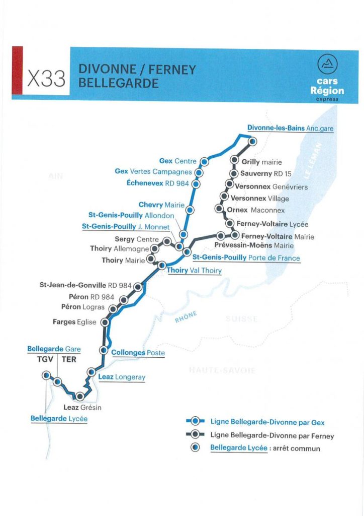 Echenevex – Echenevex, Mury – Maconnex, Arcades – Ségny Centre – Versonnex/village – Versonnex, Genevriers – Sauverny, La Croisée – Grilly, Mairie – Divonne les Bains, Ancienne Gare